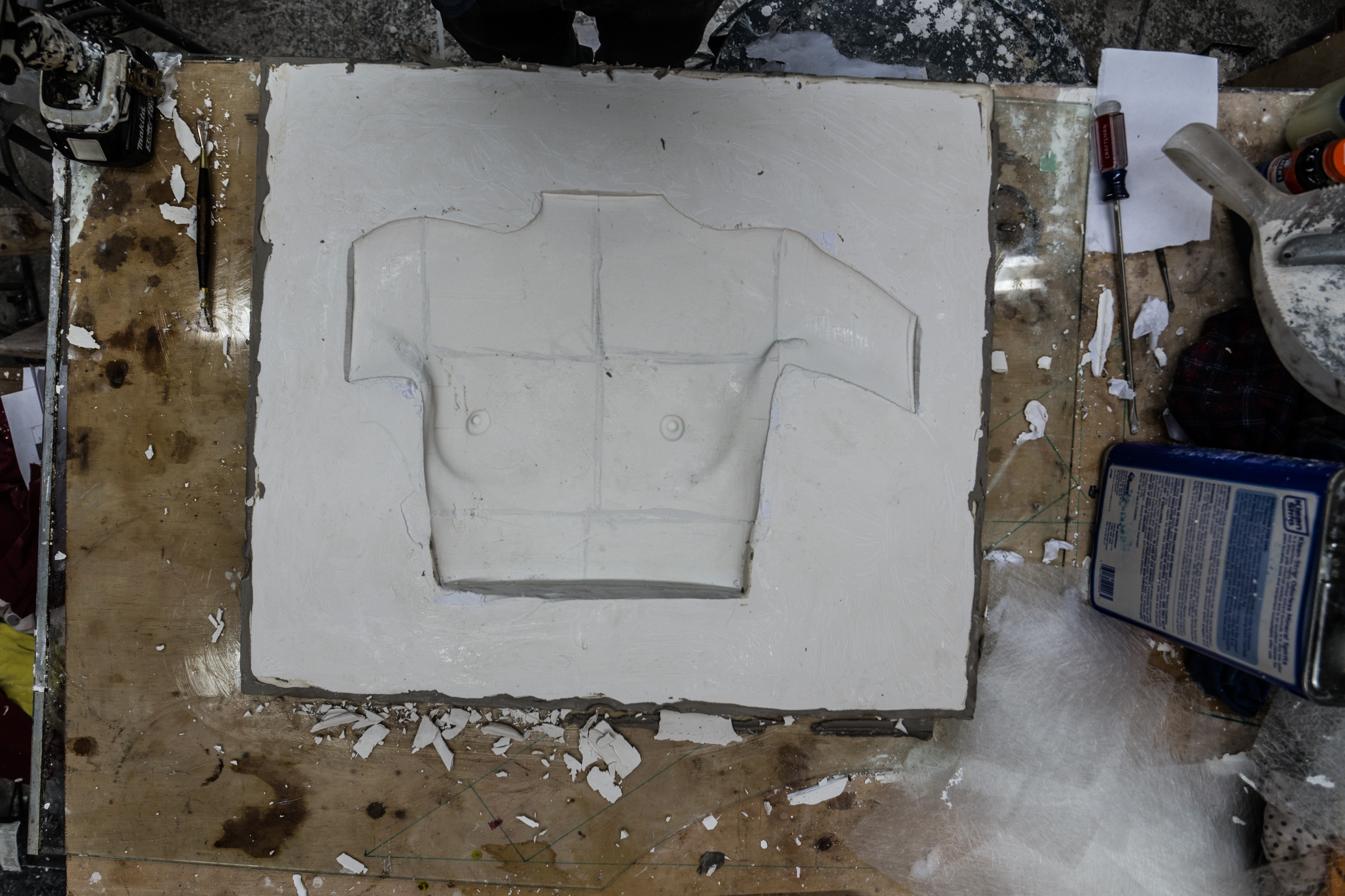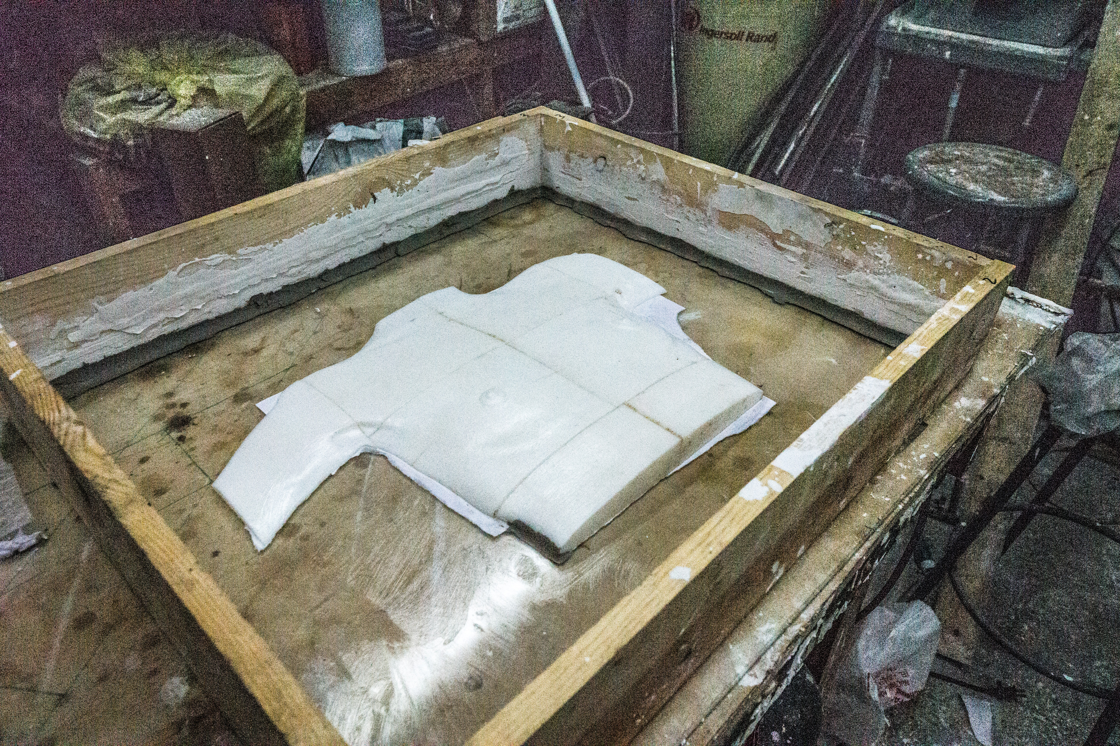 How do we get the form in glass instead of plaster? The trick is to reverse the mold. Cover it with petroleum jelly, again, then invert the mold by casting another against it, this time in plaster/silica. This will give you the positive mold on the right. We need a 50/50 mix of plaster and silica so the mold won’t explode at high temperature. More important, we lose definition each time we make a mold, so we have to use some sculpting to recover the detail.