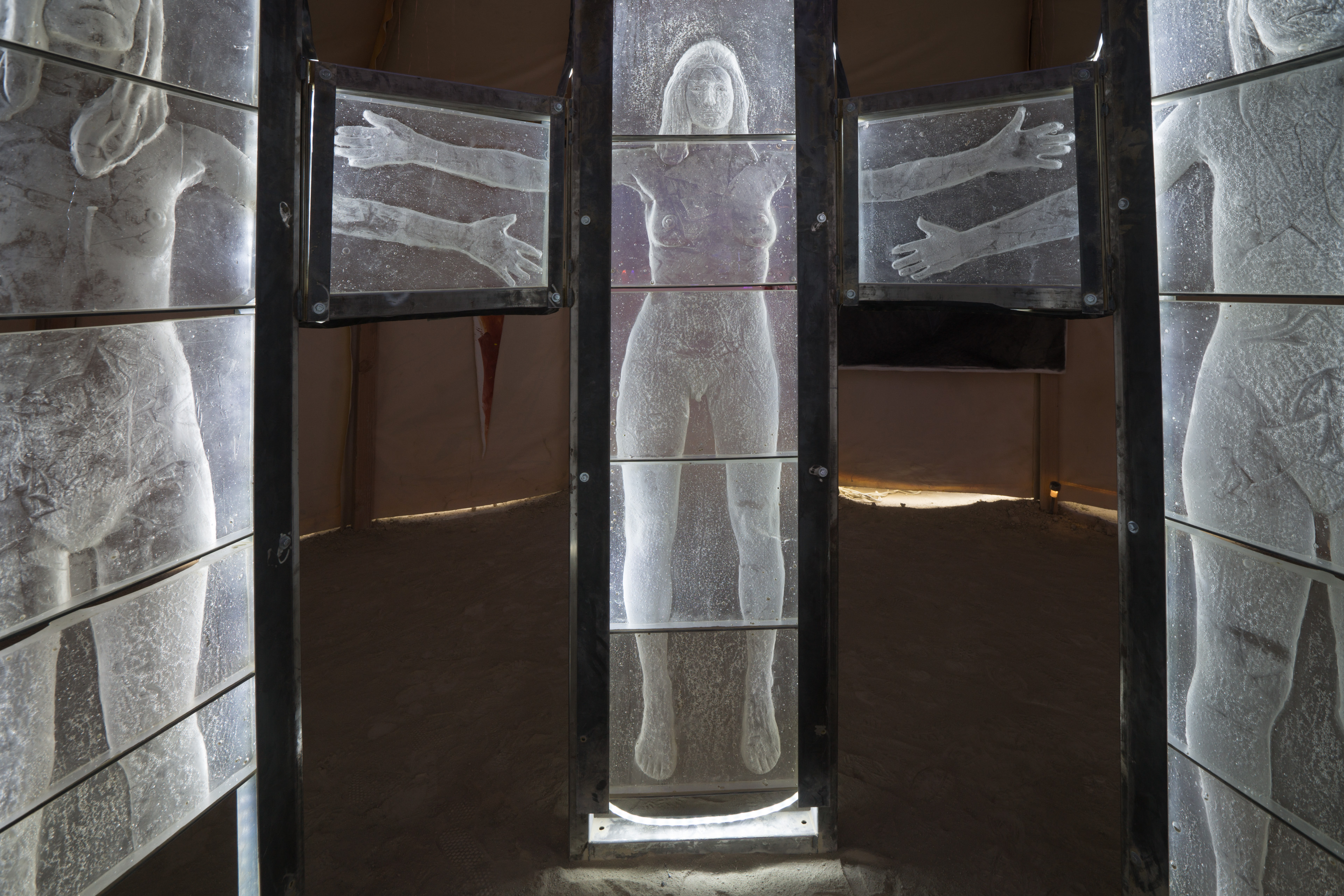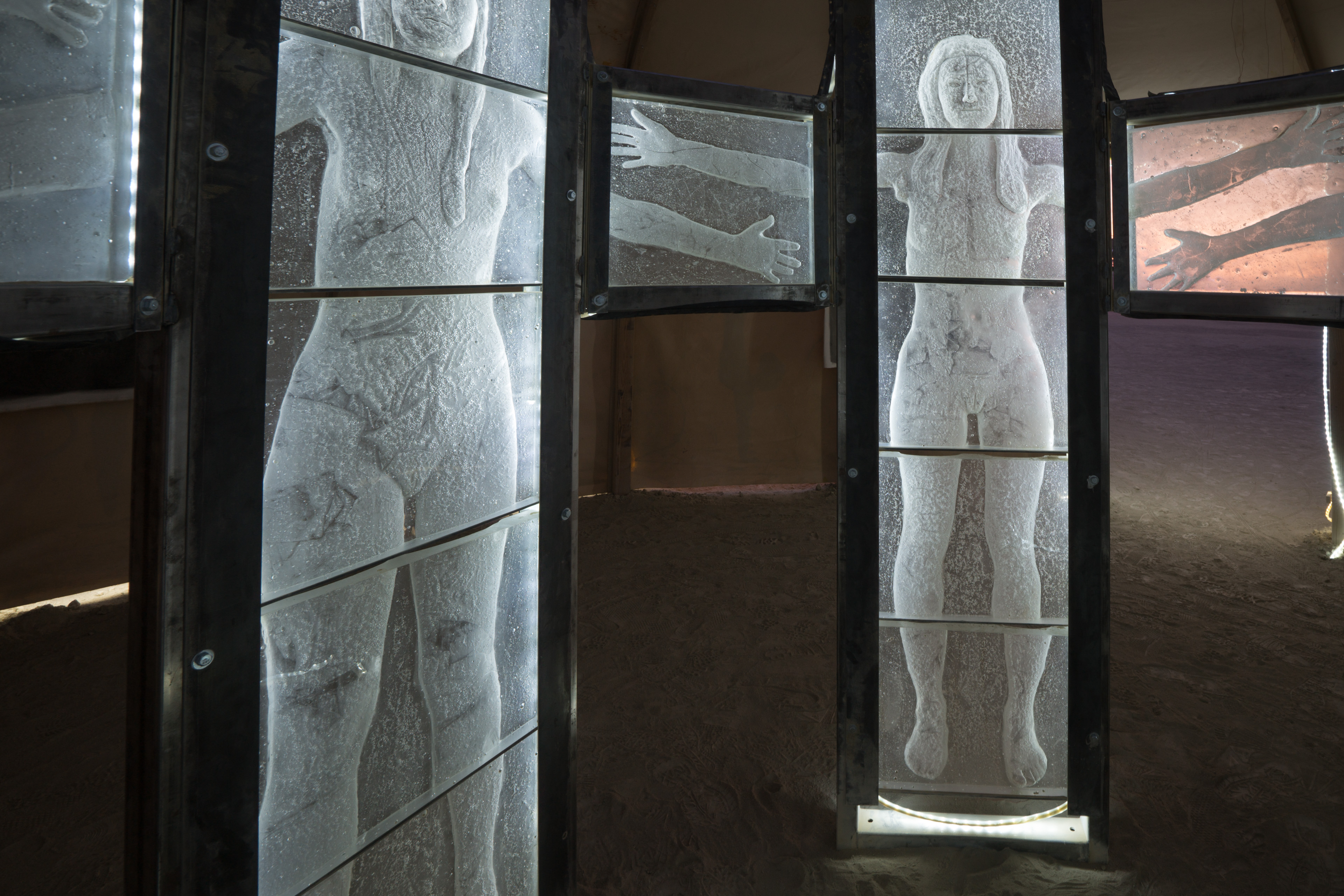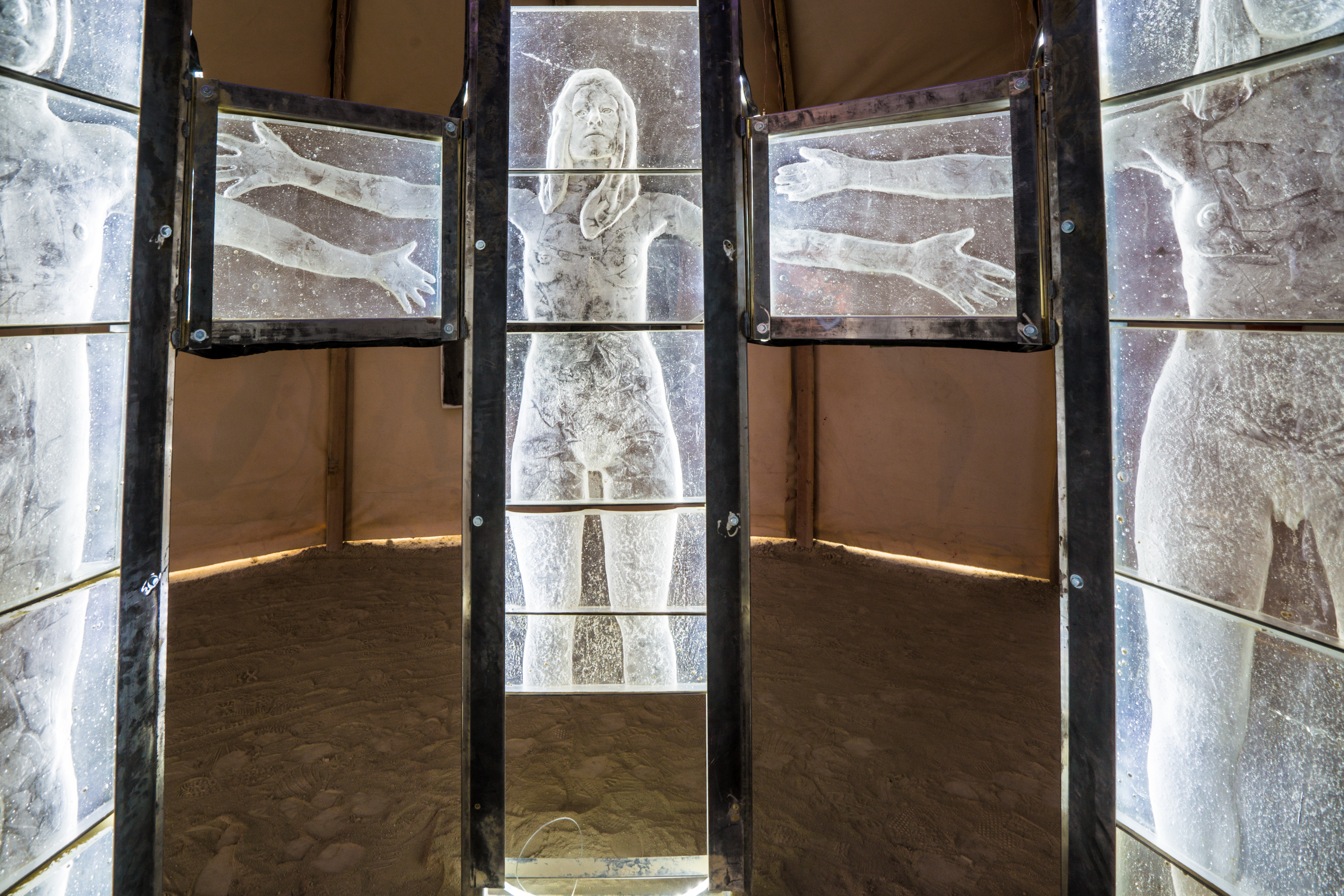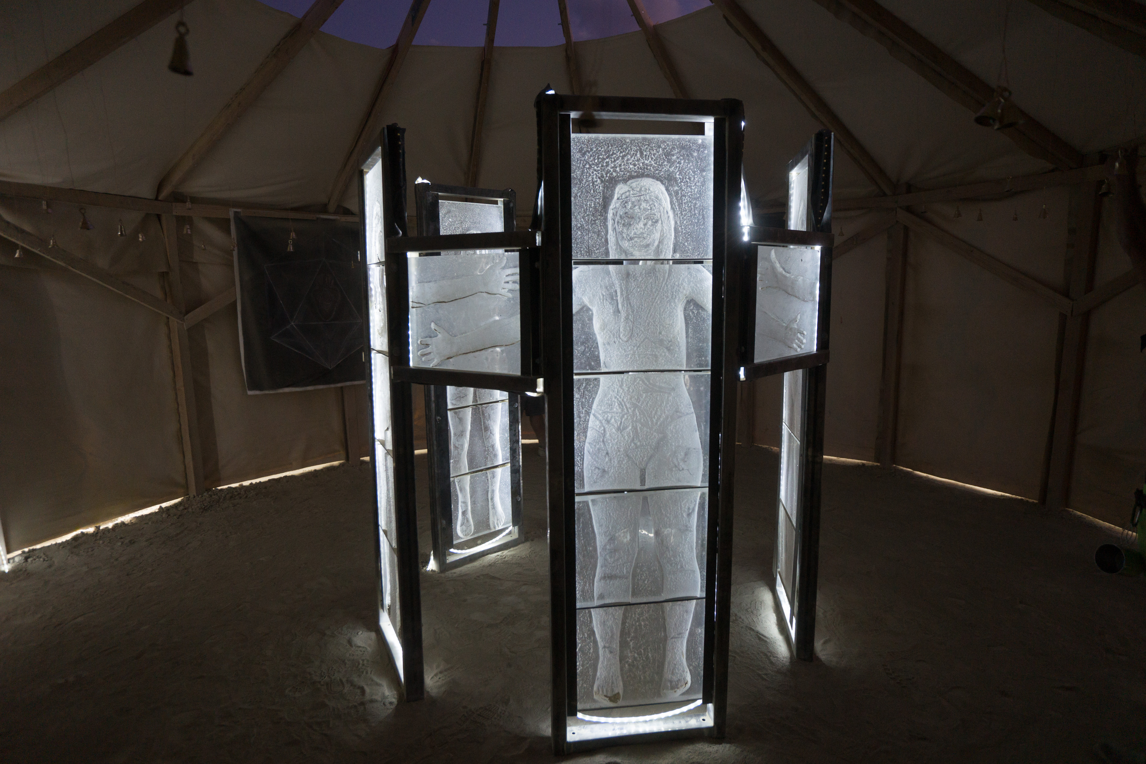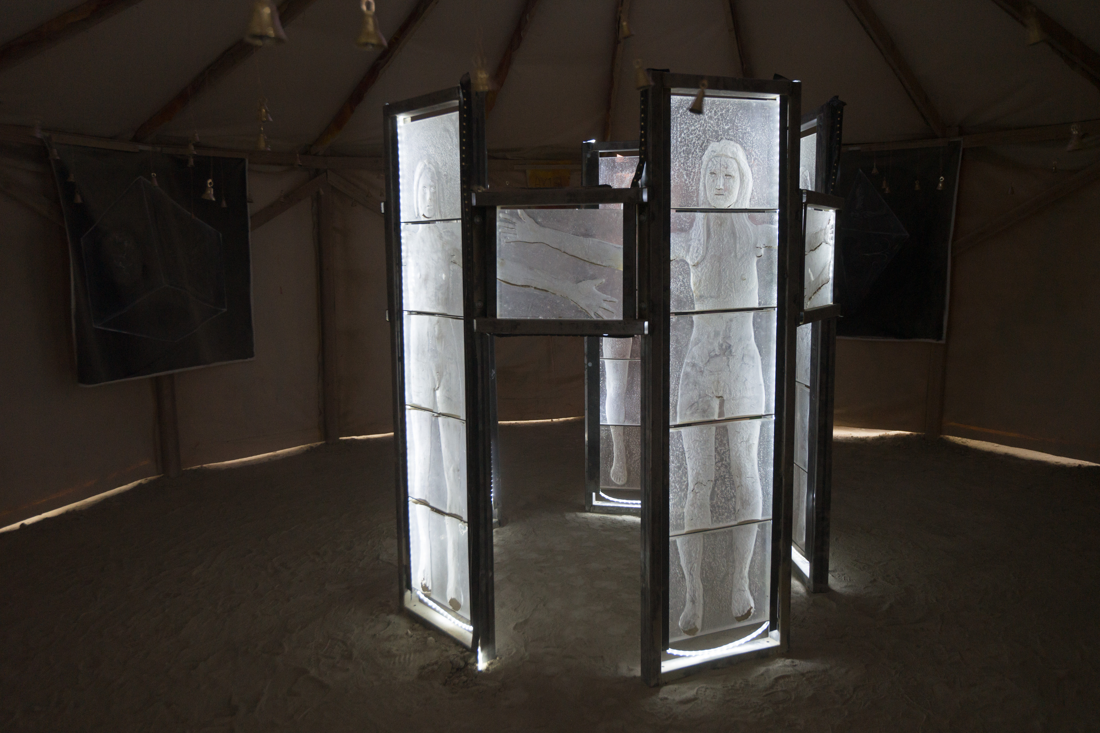 The women are cast in “negative relief,” meaning that they are inset into the back side of a block of glass. The glass itself has a flat surface, and one peers through it to see the form embedded on the reverse. Kathy painted the rest, and her work is simply wonderful. The Platonic solids are painted in oil on canvas, and the 17 women on the exterior cover some 200 square yards of canvas. Kathy did incredible research, finding colors and canvas that could withstand the bright, hot, dusty environment on the playa. Our installation was visible from every corner of the playa.