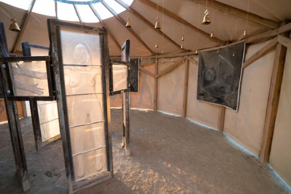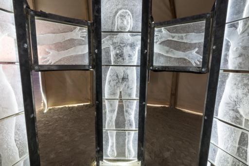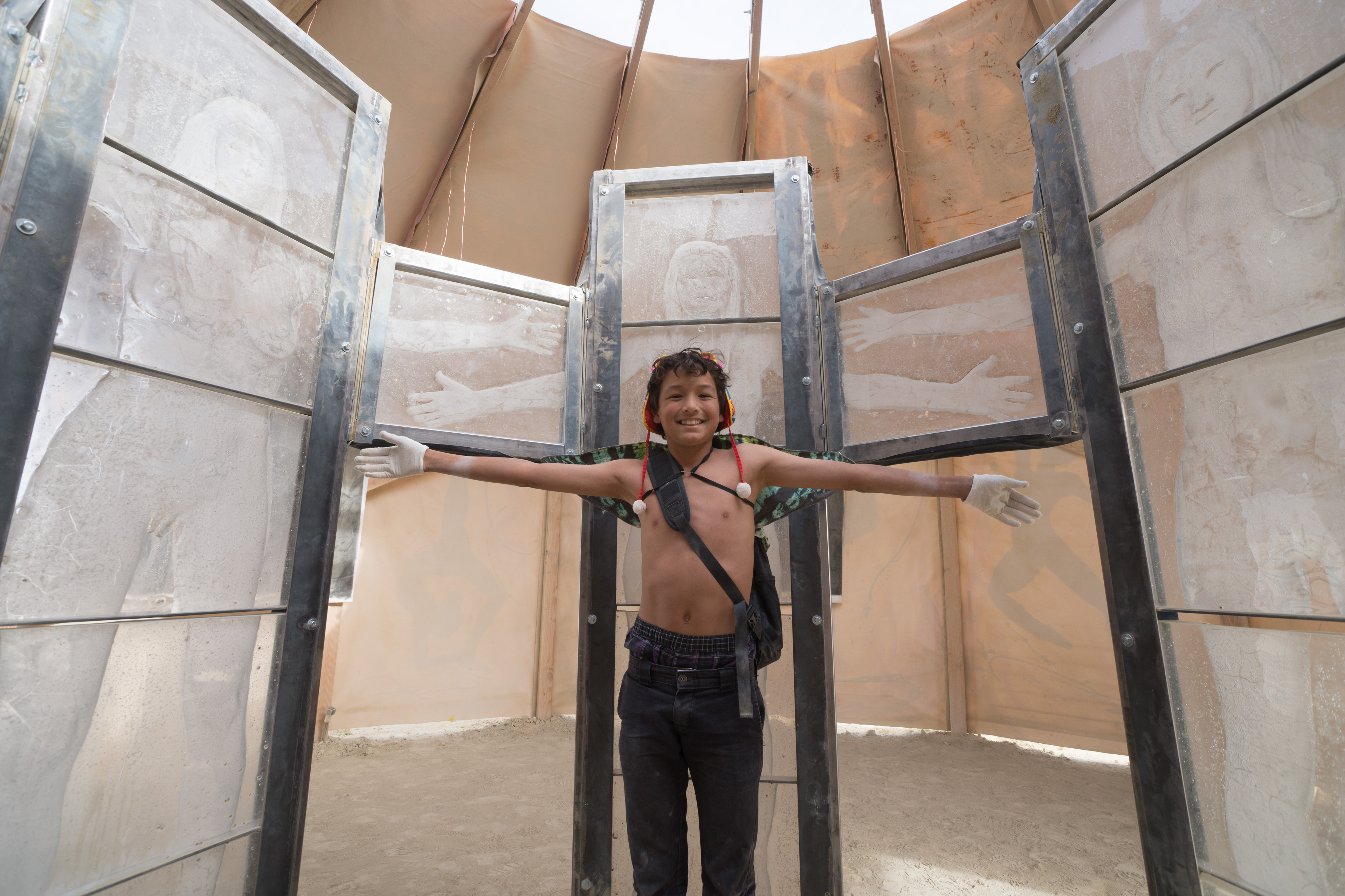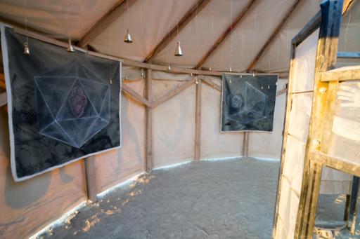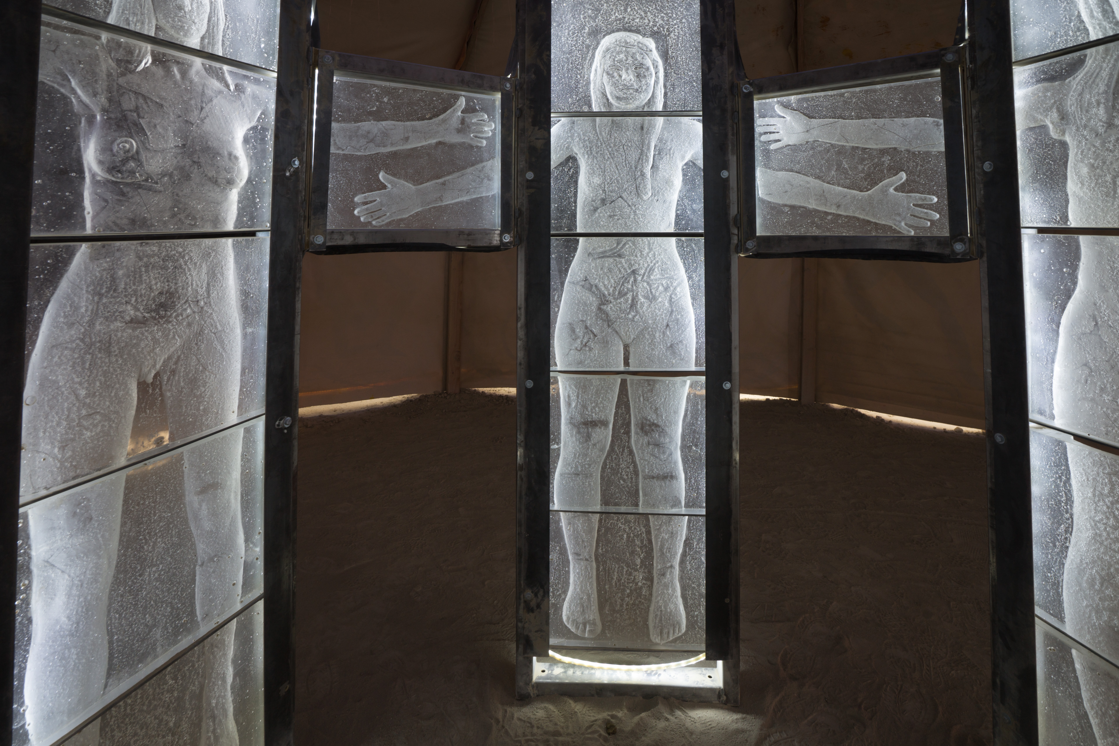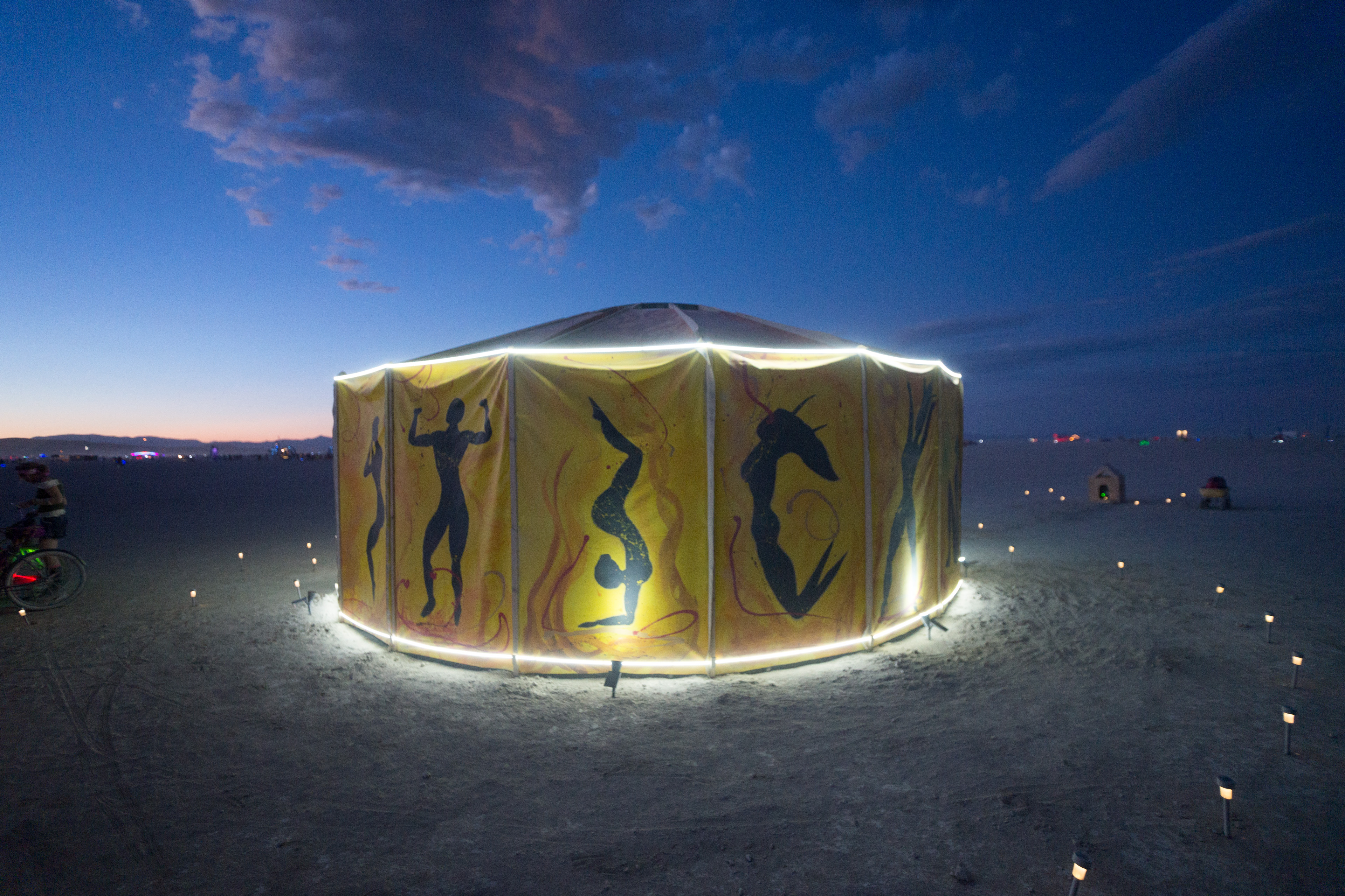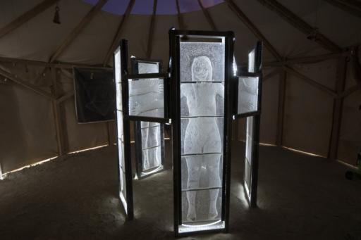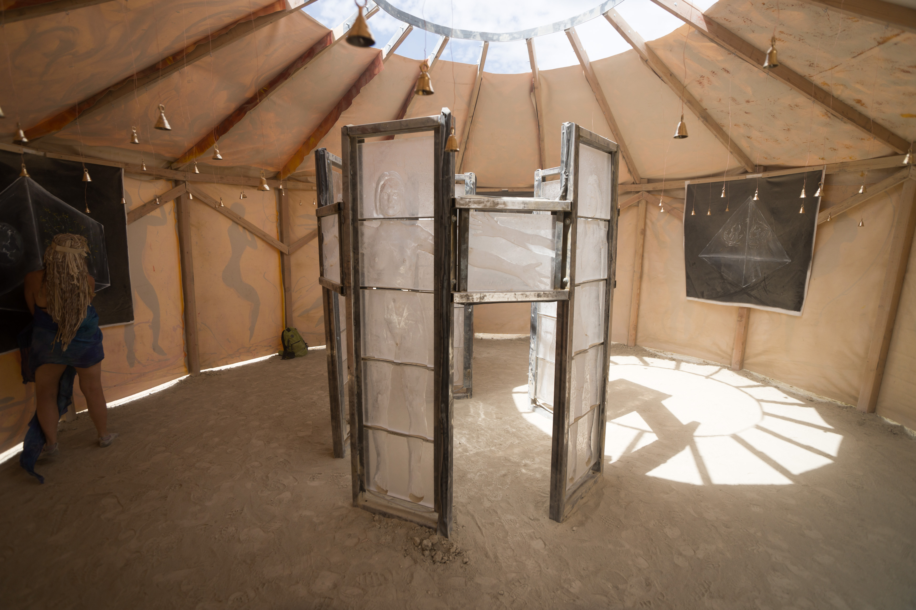 The women are cast in “negative relief,” meaning that they are inset into the back side of a block of glass. The glass itself has a flat surface, and one peers through it to see the form embedded on the reverse. Kathy painted the rest, and her work is simply wonderful. The Platonic solids are painted in oil on canvas, and the 17 women on the exterior cover some 200 square yards of canvas. Kathy did incredible research, finding colors and canvas that could withstand the bright, hot, dusty environment on the playa. Our installation was visible from every corner of the playa.