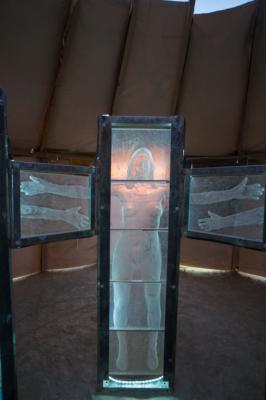 Axis Mundi is a project Kathy and I started in January, 2016 and installed at Burning Man. Actually, the project started in an unusual way. This year Kathy had managed to work with the Artery so that we were sure we could purchase tickets. We started brainstorming for ideas, and then I was told in a dream that I would cast five full size women in glass. That’s a lot of work, so in my dream I asked whether I could cast just one, and the answer was — No, you will cast five.