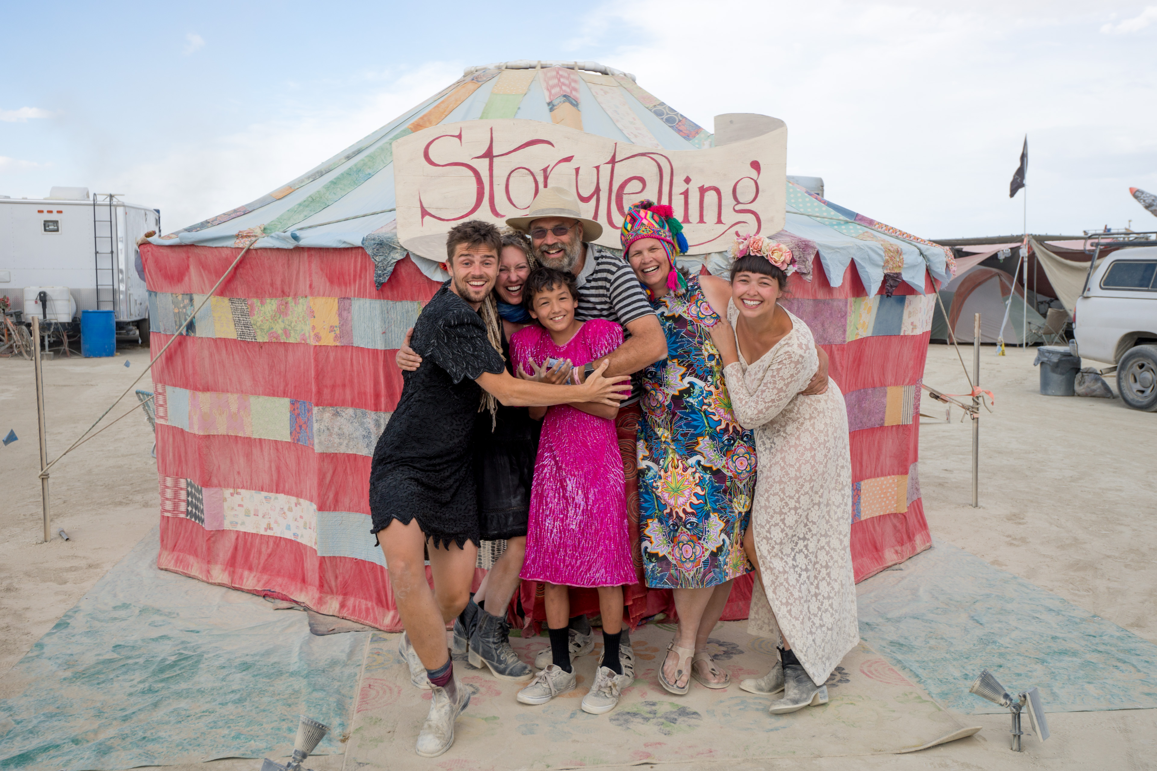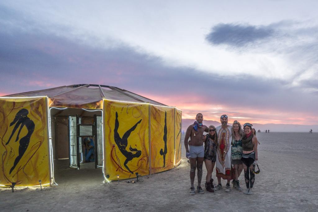 This project started with Kathy and I brainstorming ideas, working on the artwork, painting, glass, and steel. We would be nowhere without our team of supporters, especially Isabella Serrano and Philippus Kühn who have helped us in every way, from construction on the playa to a loving home camp. Here we are in joy, from left to right, Philipp, Kathy, me, Nobu, Liz, Bella.