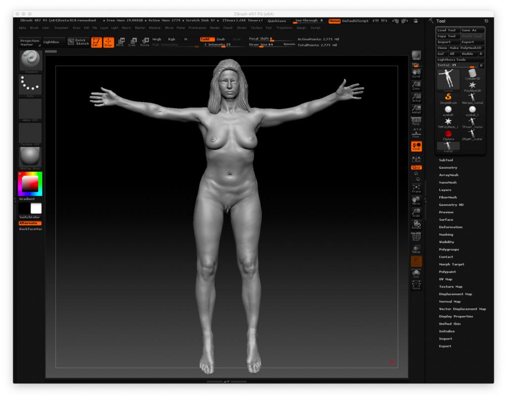 There are many things we must “fix” for the sculpture, but we want to really want to keep her form. ZBrush turned out to be really good at doing this. We want to sculpt eyes and hair, bend her arms and legs as if they were clay. This was reasonably easy in ZBrush. It took a few weeks to learn the tool (evenings only), and then perhaps one week with each model, about 2 million polygons resolution for each of the models. Here is the final Iveta that I printed.